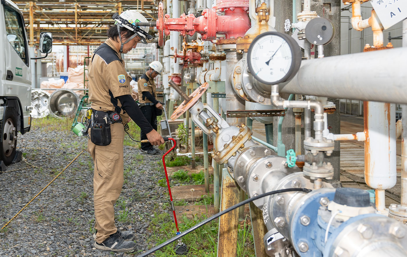 漏水、漏洩は場所を見つけるのがとても困難で、発見には非常に高度な技術と経験値が必要となります。当社では耳で漏水の音を聞き分ける音聴調査と、水素と窒素ガスを使用したトレーサガス工法の2種類の工法を取り入れて調査を行っています。