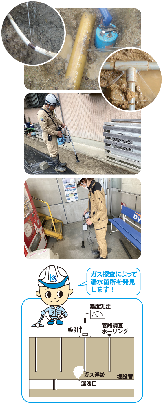 水素ガスと窒素ガスの混合ガスを管路内に注入し、漏水箇所から排出される混合ガスを地表面で探査することにより漏水箇所を発見します。通常の漏水調査では、探知不可能な環境下や微少の漏水に対して有効な工法です。